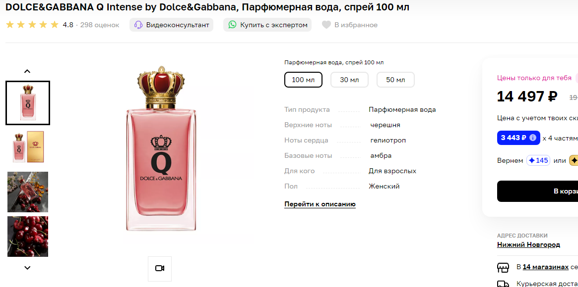Композиция аромата Q by Dolce & Gabbana Eau de Parfum Intense, которая стала «более гипнотической и дерзкой», открывается нотами черной вишни, затем переходит в сердце, где сосредоточены оттенки гелиотропа и в финале раскрывается нюансами амбры.