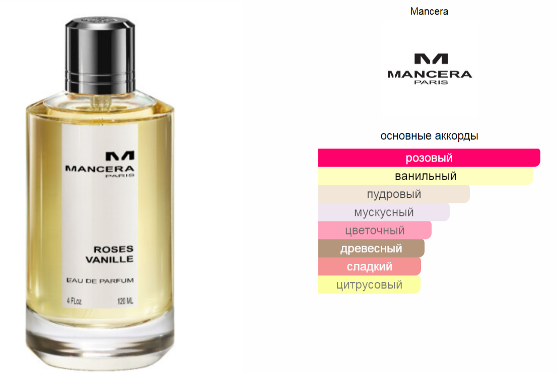 Парфюмерная композиция унисексового аромата Mancera Roses Vanille - этот удивительное сочетание ингредиентов, где начальными нотами выступают аккорды чистой воды и лимона. За ними раскрываются оттенки сахара и розы, а завершается композиция тонами ванили и белого кедра, белого мускуса и сахара.