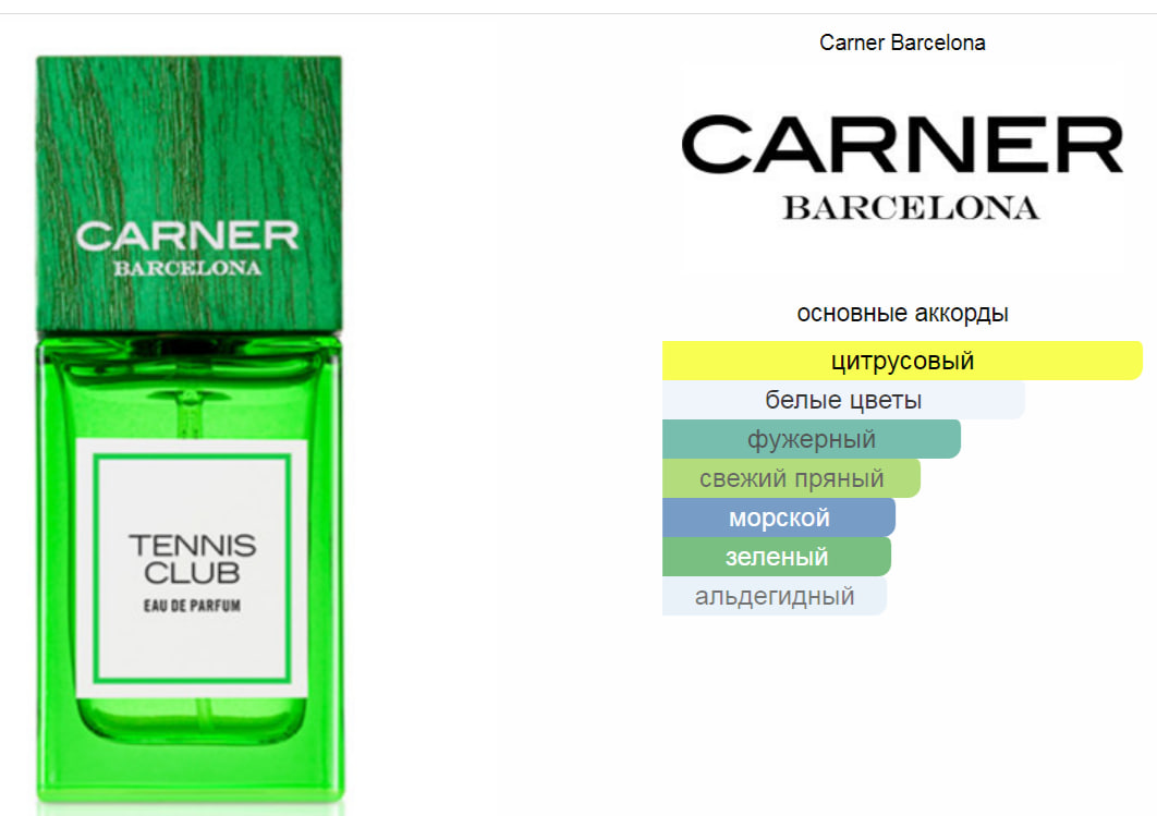Tennis Club Carner Barcelona 100мл. Верхние ноты: Бергамот, Петитгрейн и Красный апельсин; средние ноты: Нероли, Цветок апельсина и Морская вода; базовые ноты: Солнечные ноты, Мускус и Кедр