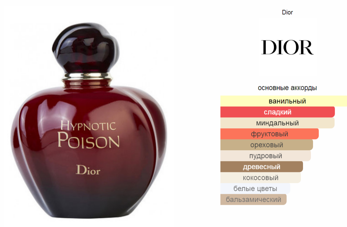 Относится к восточно-гурманской группе. Начальные его ноты - кокос, абрикос и слива. Средние ноты - тмин, палисандр, тубероза, роза, жасмин, ландыш. Базовые тона - сандал, миндаль, мускус и ваниль.