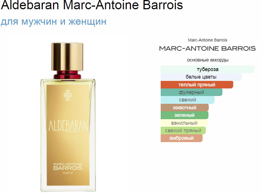Унисекс-аромат Aldebaran, созданный парфюмером Quentin Bisch для дома Marc-Antoine Barrois в 2025 году — это ольфакторное путешествие к одной из ярчайших звезд на небосводе. Названный в честь оранжевого гиганта в созвездии Тельца, аромат открывается опьяняющей туберозой — белым цветком, чье благоухание усиливается в ночных сумерках, словно свет далекой звезды.