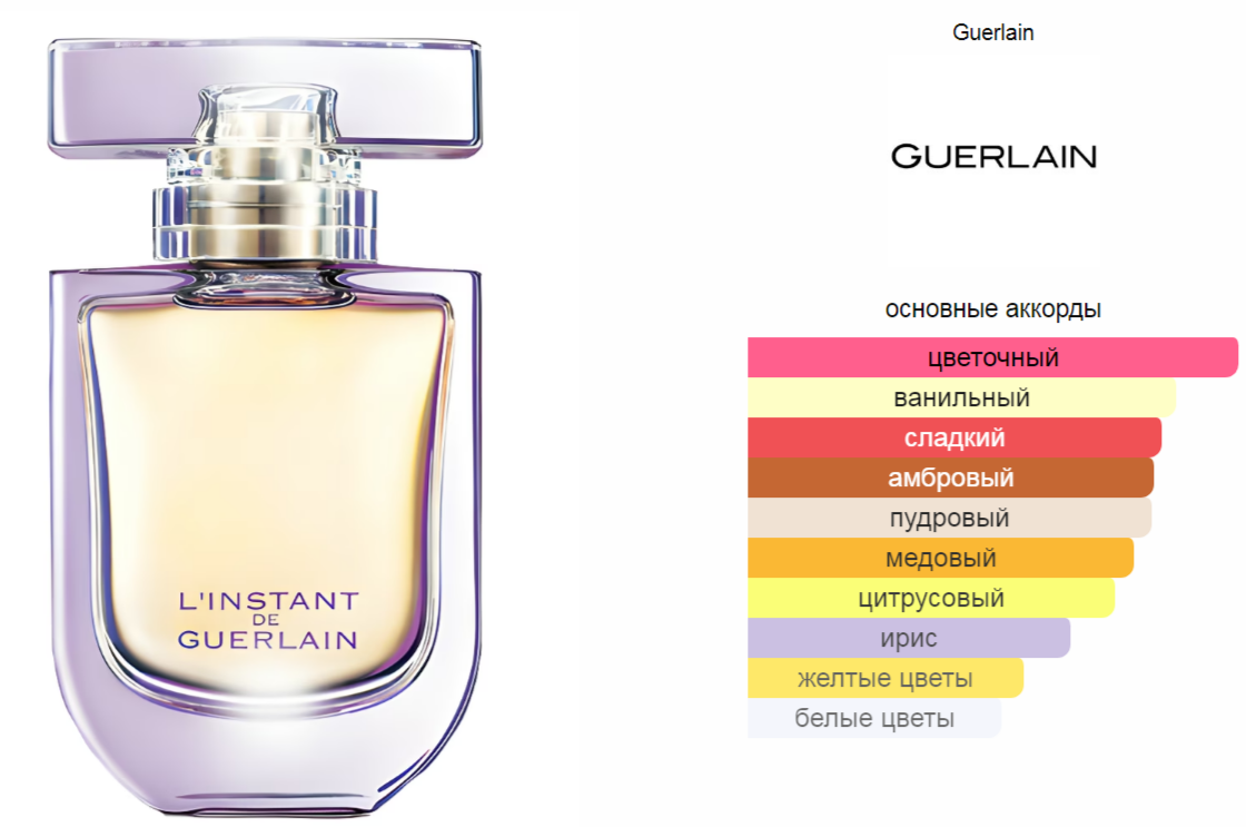 Верхние ноты: Мандарин, Красное яблоко и Бергамот; средние ноты: Магнолия, Ирис, Иланг-иланг и Жасмин; базовые ноты: Белый мед, Ваниль, Амбра, Бензоин и Мускус.