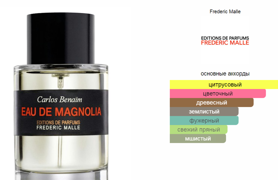 Верхние ноты: Калабрийский бергамот, Лимон и Зеленые ноты; средние ноты: Магнолия, Ветивер, Пачули, Калон и Жасмин; базовые ноты: Мох, Кедр и Амбра