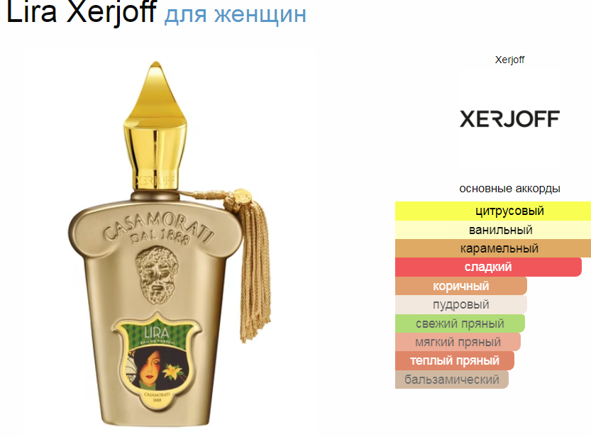 Во вступлении звучат пряный бергамот и корица, сочный сицилийский апельсин, а также нежная роза и лаванда. В сердечных нотах аромат смешивает ванильно-карамельные аккорды с восточными специями и цветами солодки. В шлейфе проявляются бергамот, мускус, лаванда и карамель.