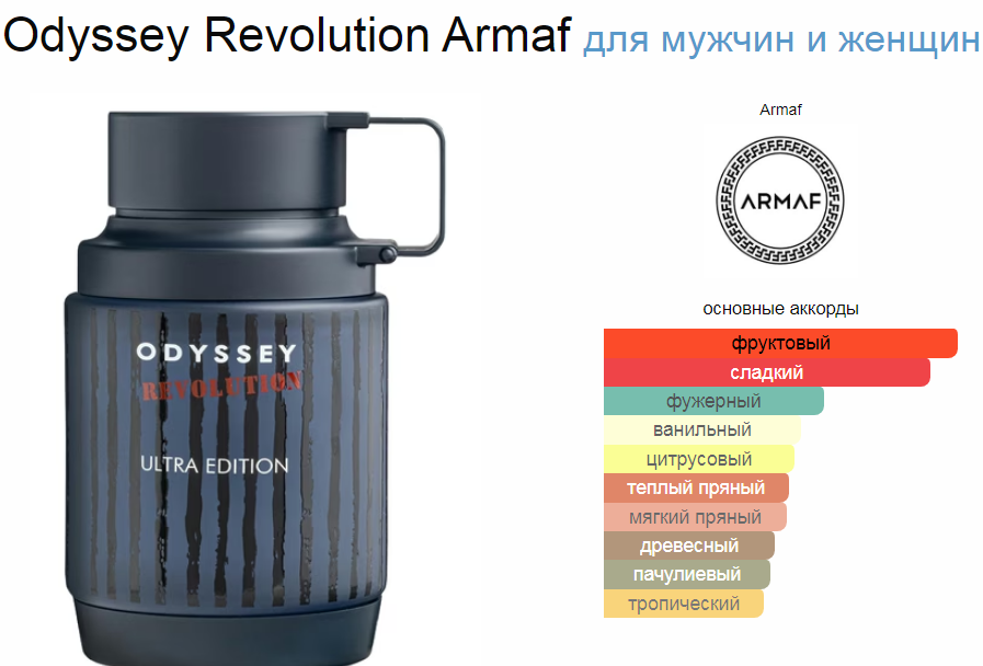 Верхние ноты: Ананас, Черная смородина, Красный апельсин и Шалфей; средние ноты: Пралине, Ваниль, Кардамон и Слива; базовые ноты: Бобы тонка и Пачули.