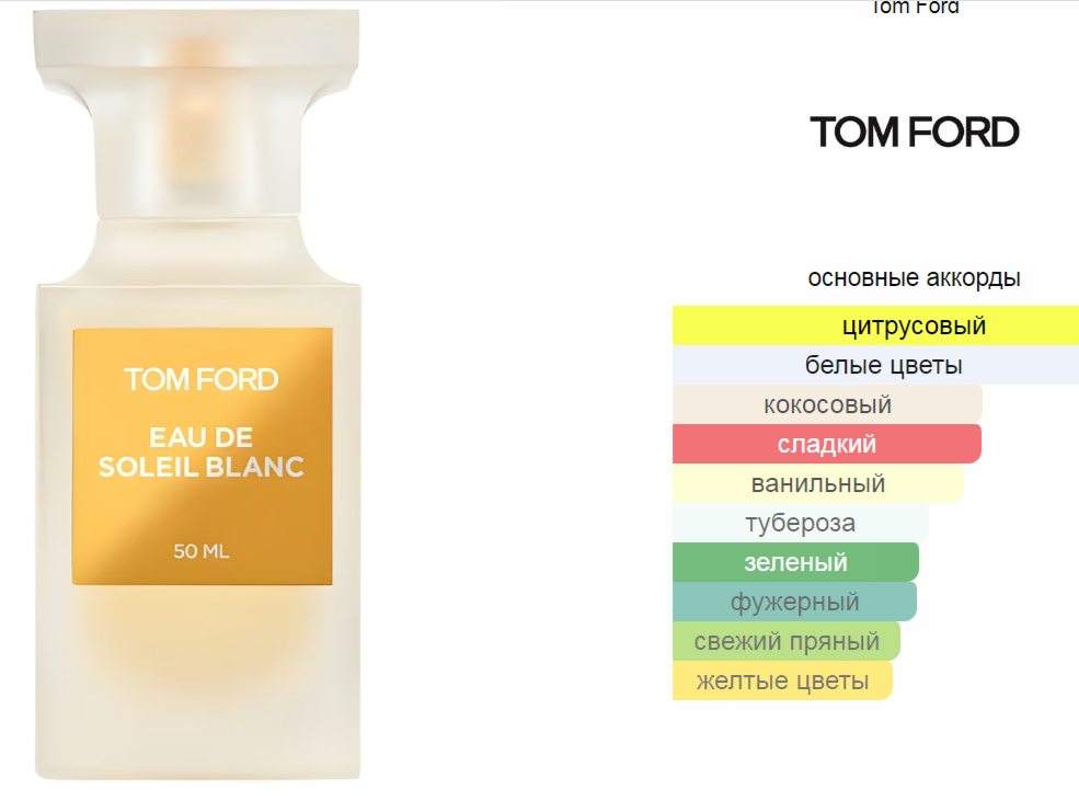Верхние ноты: Горький апельсин, Нероли, Бергамот, Цитрон, Фисташки, Петитгрейн, Кардамон, Розовый перец и Тмин; средние ноты: Тубероза, Тунисский апельсиновый цвет, Иланг-иланг, Жасмин и Гальбанум; базовые ноты: Кокос, Ваниль, Бобы тонка, Амбра и Бензоин.