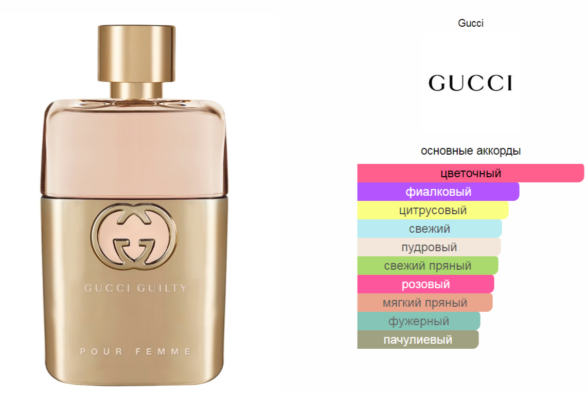 Верхние ноты: Розовый перец, Мандарин и Бергамот; средние ноты: Сирень, Фиалка, Герань и Роза; базовые ноты: Пачули и Амбра.