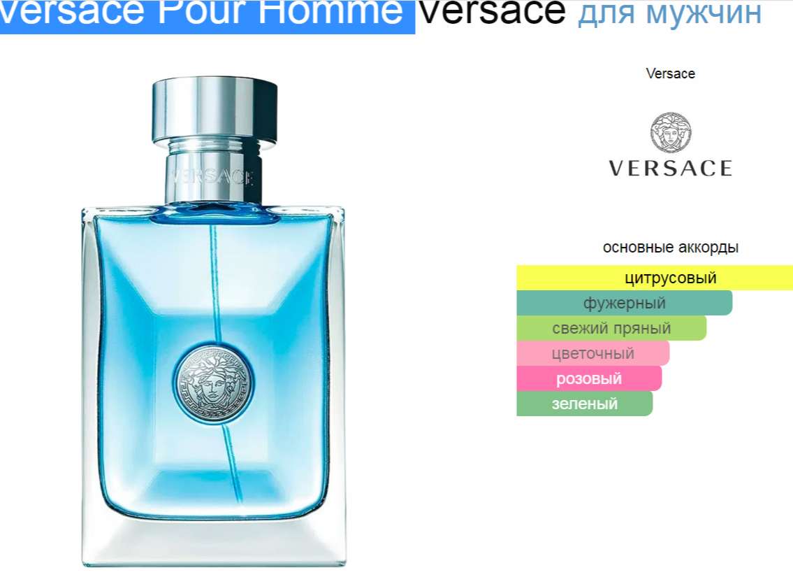 Верхние ноты: Лимон, Бергамот, Нероли и Майская роза; средние ноты: Гиацинт, Кедр, Мускатный шалфей и Герань; базовые ноты: Мускус, Бобы тонка и Амбра
