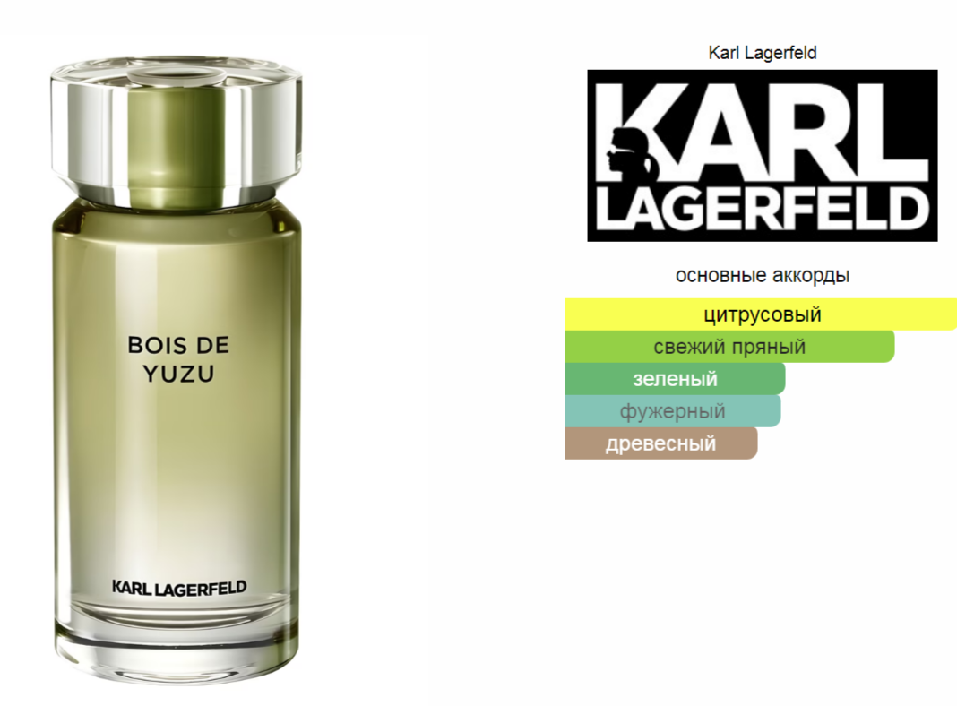 Верхние ноты: Юзу, Имбирь, Грейпфрут, Бергамот, Мандарин, Розмарин и Мята; средняя нота: Мускатный орех; базовые ноты: Мох и Папирус.