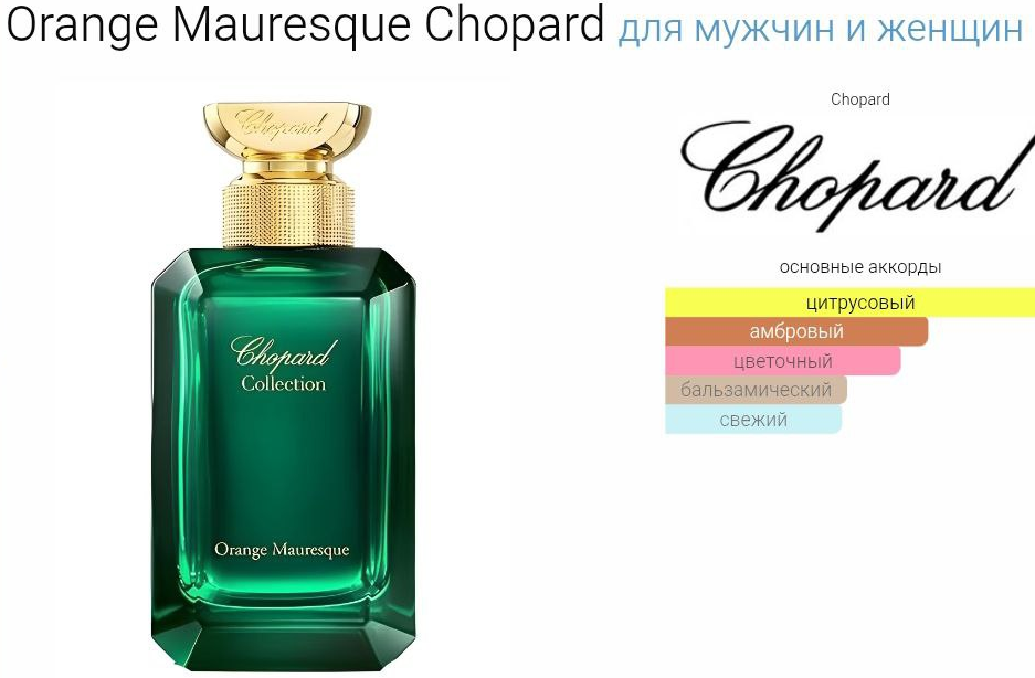 В композиции, гармонично дополняя друг друга, переплетаются аккорды апельсина и цедры с цветочными нотами и чувственностью амбры, нероли и сиамский ладан