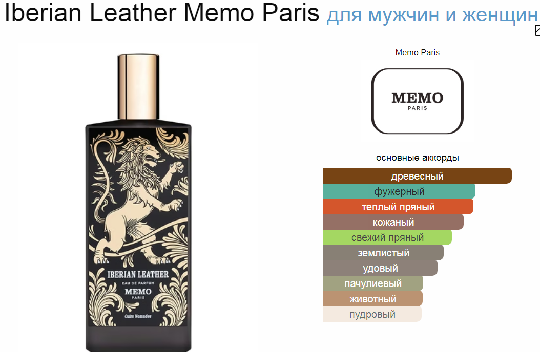 Верхние ноты: Герань, Розмарин, Кориандр и Бергамот; средние ноты: Шафран, Гвоздика (пряность), Ирис, Корица, Роза, Османтус, Жасмин и Ландыш; базовые ноты: Кожа, Уд, Пачули, Ветивер, Дубовый мох, Амбра, Сандал, Кедр, Пихтовый бальзам, Мускус и Ваниль