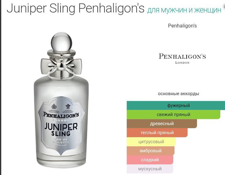 .Juniper Sling Penhaligon's 100мл. Верхние ноты: Ягоды можжевельника, Апельсин, Ангелика и Корица; средние ноты: Перец, Кардамон, Кожа и Корень ириса; базовые ноты: Ветивер, Сахар, Вишня и Амбра.
