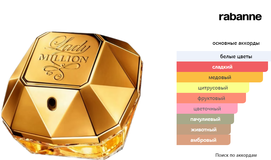 Верхние ноты: Малина , Нероли и Лимон; средние ноты: Жасмин, Африканский апельсиновый цвет и Гардения; базовые ноты: Белый мед, Пачули и Амбра