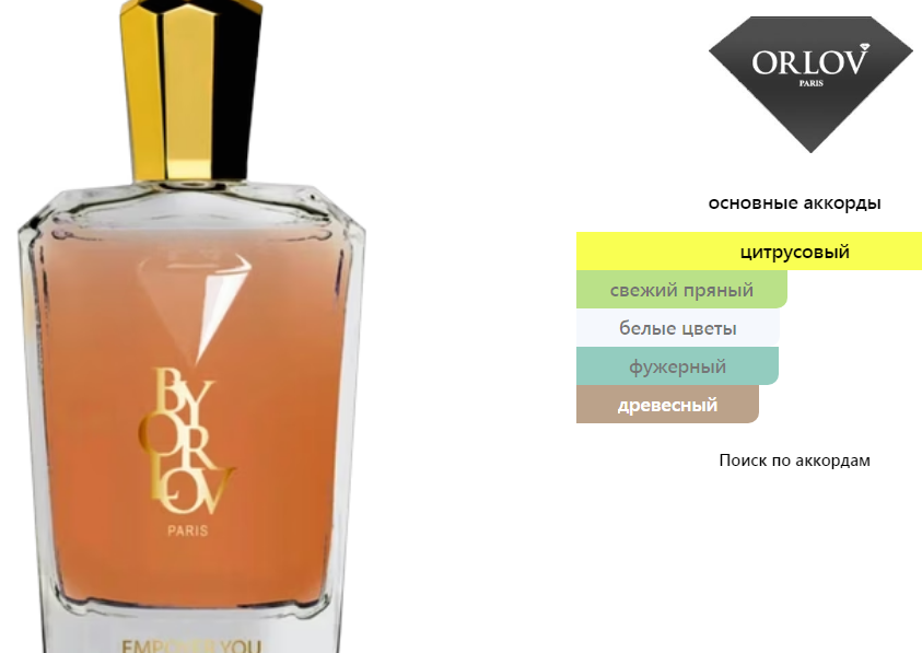 Верхние ноты: Желтый мандарин, Красный апельсин, Грейпфрут, Бергамот, Лимон, Лист черной смородины и Имбирь; средние ноты: Цветок апельсина, Болгарская роза, Жасмин Самбак и Герань; базовые ноты: Кедр, Мускус, Пачули, Ладан и Уд