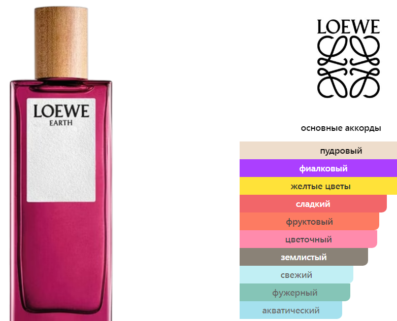 Цветочно-фруктовый с тонкими амбровыми и мускусными полутонами LOEWE Earth отражает эту взаимосвязь нотами трюфеля, живущего под землей, а также груши, элеми, мимозы и фиалки, формируя яркий, необычный и неожиданный парфюм